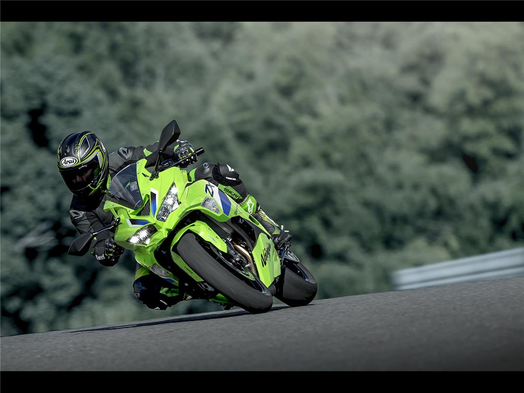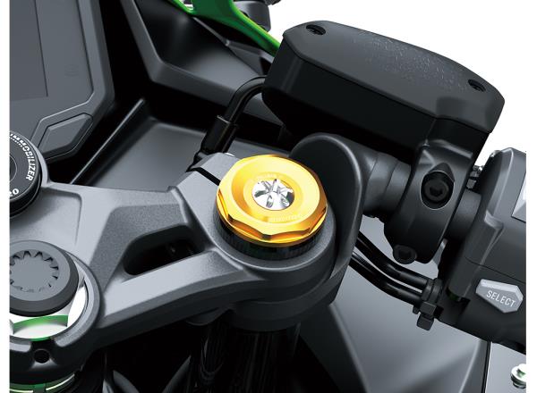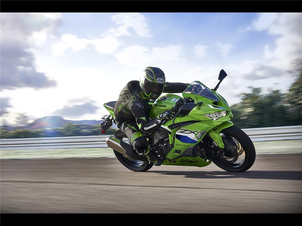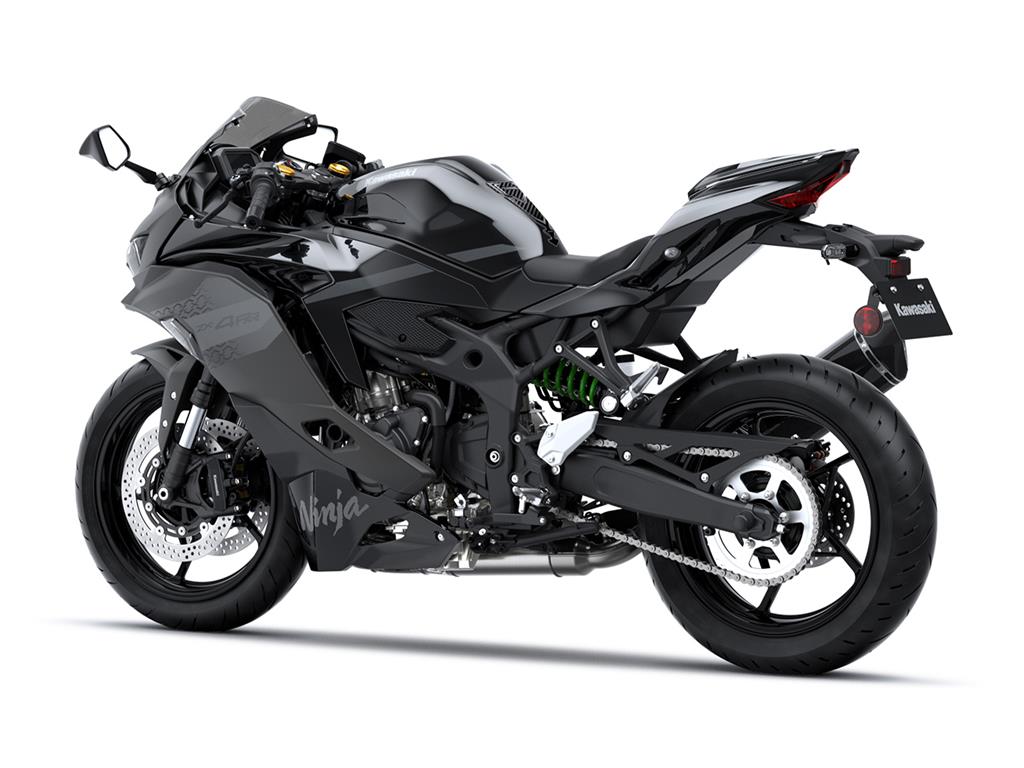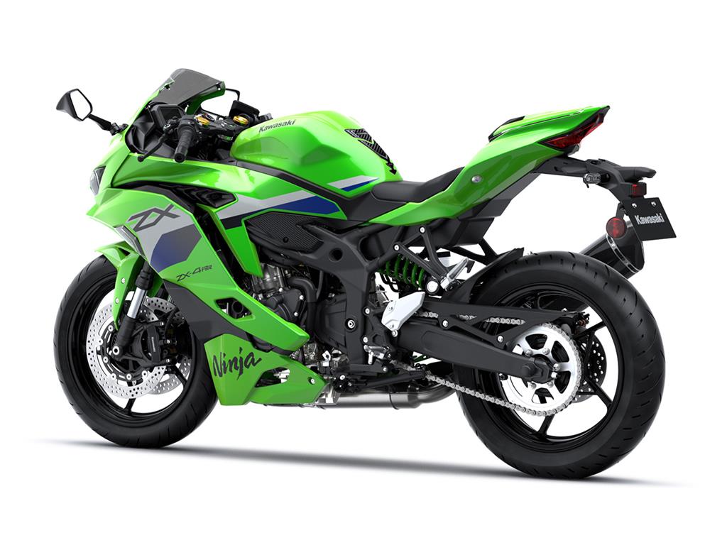 The Ninja ZX-4R’s ø37 mm inverted fork uses SFFBP internals to offer both racetrack performance and everyday usability while the Horizontal Back-link rear suspension offers a progressive character. Offering increased adjustability, the Ninja ZX-4RR front fork includes an adjustable spring preload.