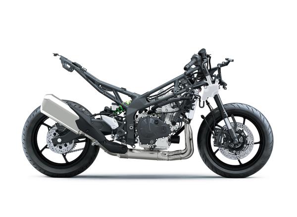 Key chassis dimensions (centre of gravity position, swingarm pivot position, engine axis positions, caster angle, etc) were inspired by Kawasaki’s World Superbike Ninja ZX-10RR racer, bringing WorldSBK chassis design thinking to the 400cc class.