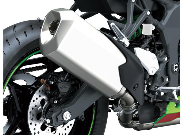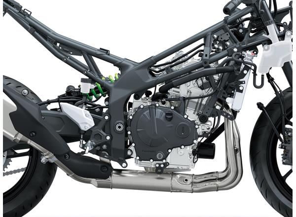 Kawasaki takes 400cc engine performance to a new level, achieving an unprecedented 57 kW (77 PS) of power. The howl of the engine as it revs beyond 15,000 min-1 adds to rider exhilaration. A quick-revving nature and direct throttle response are complemented by a flexible character that offers strong low to mid-range torque for city riding, as well as screaming high-rpm power ideal for sport or track riding.